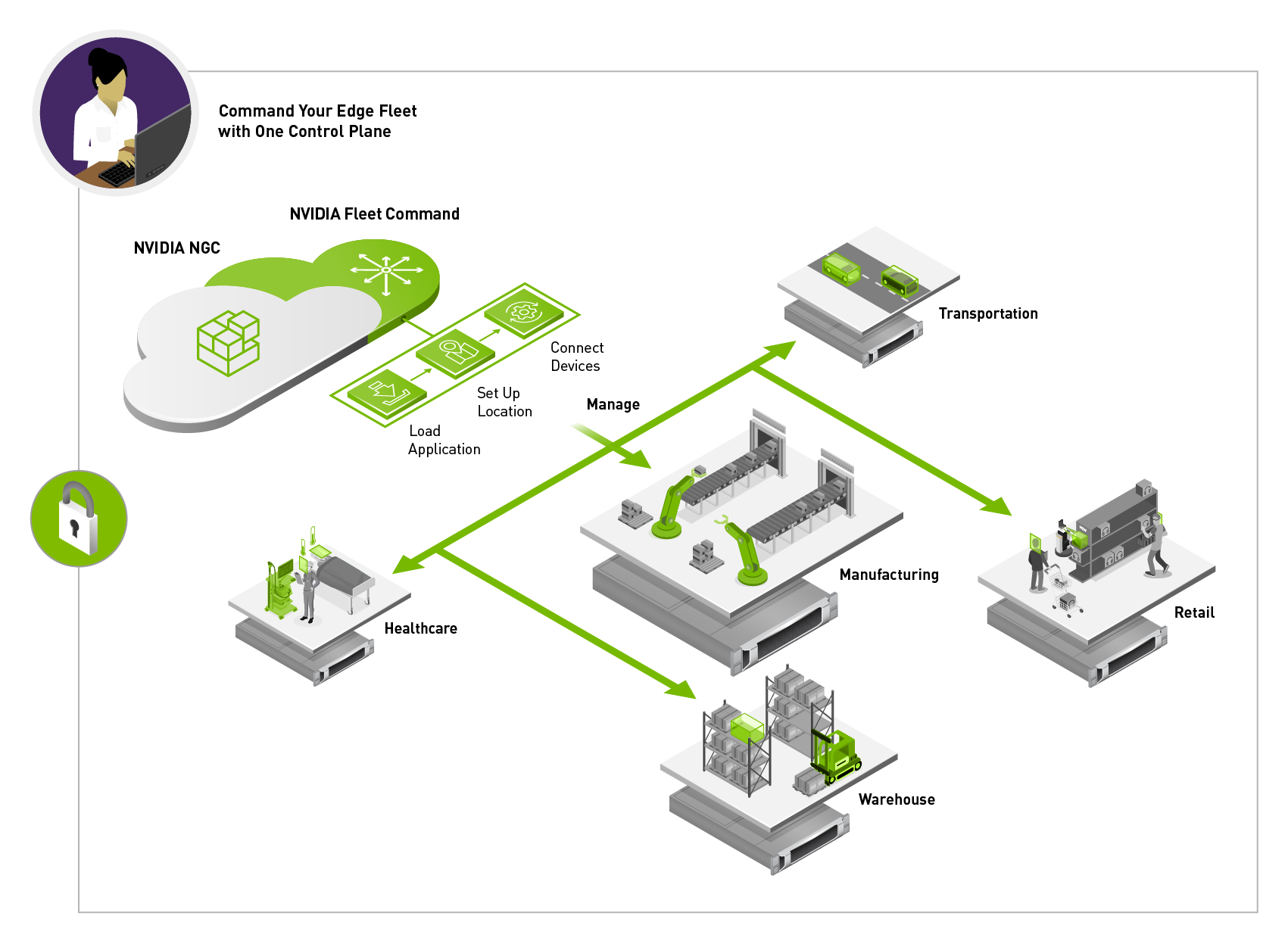 隨時隨地部署 AINVIDIA Fleet Command? 是一項可在分布式邊緣基礎(chǔ)設(shè)施中安全地部署、管理和擴展 AI 應(yīng)用程序的托管云服務(wù)。Fleet Command 專為 AI 打造,是適用于 AI 生命周期管理的一站式解決方案,可提